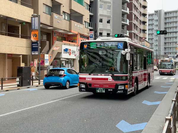 ▲300番台も新車代替が続き、社番3000番台が起こされました。こちらはD3016号車の後ろ姿。ノンステップバスのシンボルマークはE9050号車以来おなじみですが、路線車が全部ノンステップになった現在では、再塗装の際に消された車もあります。ちなみに前方のパチンコ店「GAIA」は2023年10月に民事再生法を申請する事態となりましたが、2025年に経営者が交代し、再建されています。(2021年11月16日)